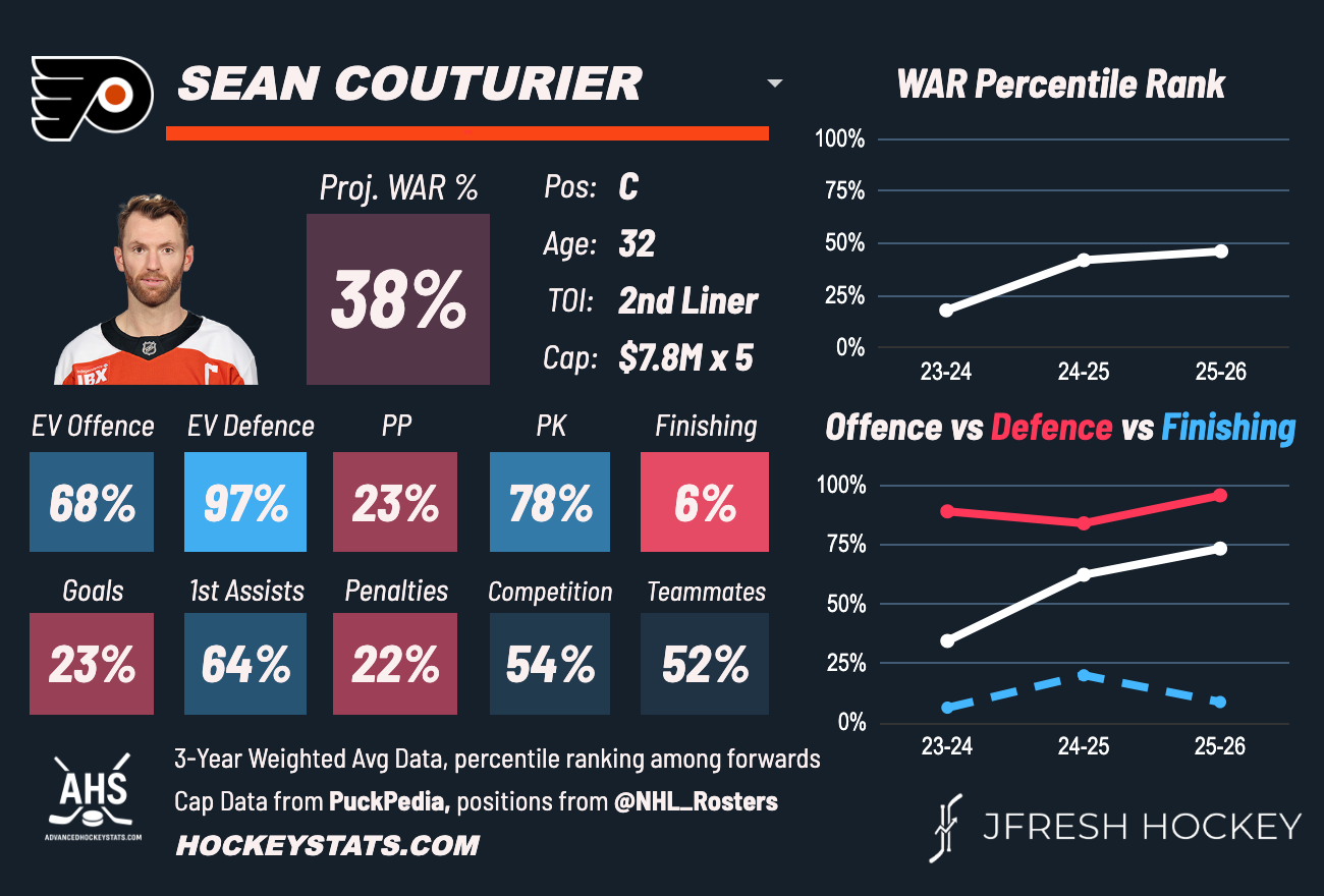 I'm a big ol' nerd. If you follow me on social media or have read anything I've ever published, that much is clear. I'm going to be naturally bullish on a player like Couturier, who at his peak was an underlying stats monster even if he wasn't putting up 100-point seasons. The player card above tells the tale as much: he's a player who drives a decent amount of offense, is dominant at preventing chances when he's on the ice, but is really struggling to put the puck into the net. That's roughly a middle six center in terms of value in my estimation, a bit more in my opinion than the projected wins above replacement (WAR %) seen above.