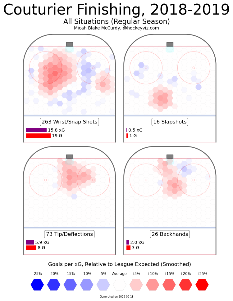 You can tell from the above that in most areas of the ice, Couturier is shooting below average. Most of his expected goals come from around the net and in tight. There's a little bit of an above-average shot from a small distance away. His tips/deflections still look about average, even if they're a smaller portion of his shot diet.