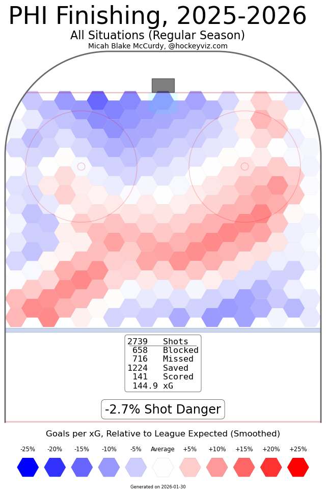 Lots of plus shooting from distance, a little softer around the net. This has been an area of focus for Tocchet since his arrival: get pucks to the net and crash it. The Flyers haven't been particularly dangerous yet with that strategy.