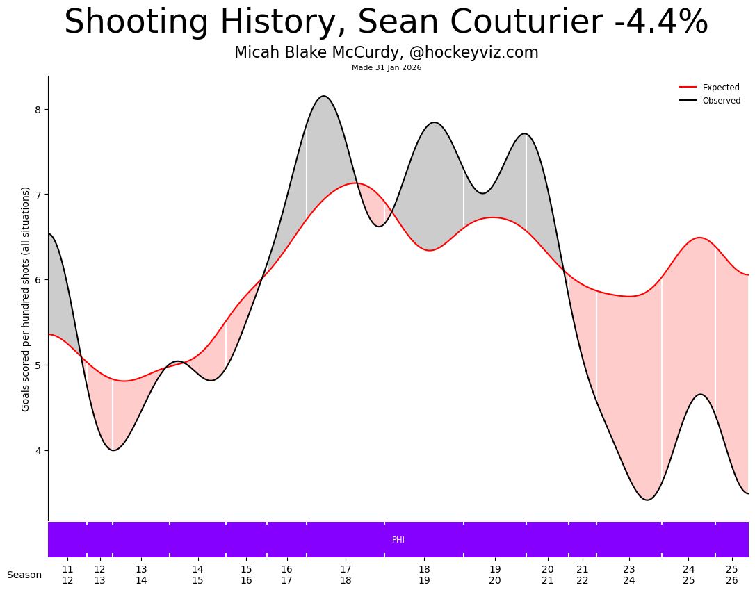 I do believe at this time, with the recent trends, there is a chance Sean Couturier's scoring touch is just depleted. Goal scorers tend to remain goal scorers into their thirties, and this just might be what the tail end of Couturier's offensive game looks like. Watching the game, he's had a hard time controlling the puck in the zone and getting dangerous chances off.